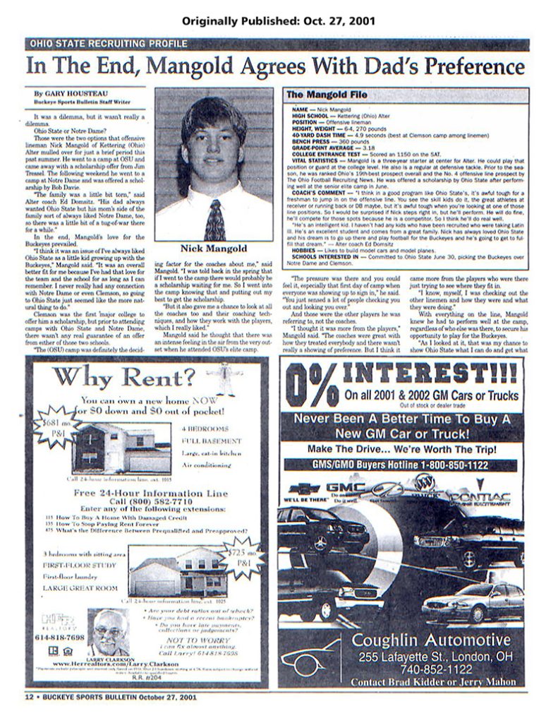 In this edition of Reprint Thursday, Buckeye Sports Bulletin looks back on the Ohio State career of center Nick Mangold, who passed away on Oct. 25, from his recruitment to Ohio State until the time he was drafted by the New York Jets in the first round of the 2006 Read More