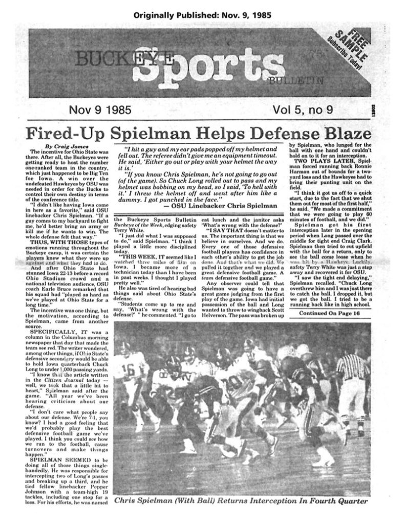Buckeye Sports Bulletin publisher Frank Moskowitz is fairly certain that BSB has reprinted stories about Ohio State’s 22-13 victory over top-ranked Iowa on Nov. 2,1985, for Reprint Thursday before.