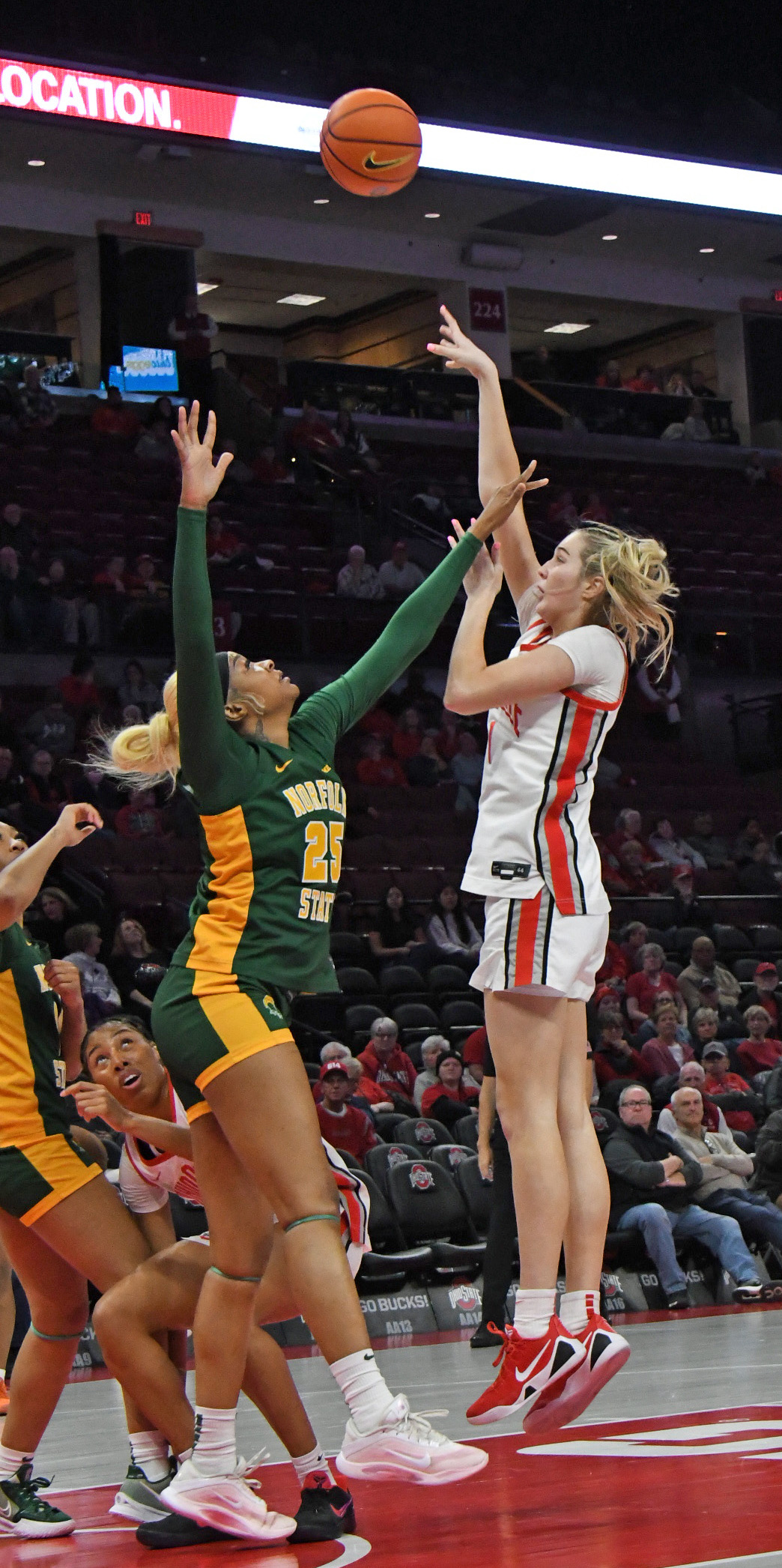 Norfolk State ended a brief scoring drought with a three-point jumper at the 3:48 mark of the second quarter, but Ohio State scored the final six points of the first half to go into the break with a 43-21 lead.