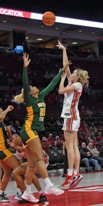Kitts was Ohio State’s leading scorer in the win. The Buckeyes’ redshirt freshman forward shot 6-12 from the field to score 13 points. She also led the team with 10 rebounds. Jaloni Cambridge (11 points) and Biriuk (10 points) also reached double figures. Kennedy Cambridge led Ohio State with six assists.