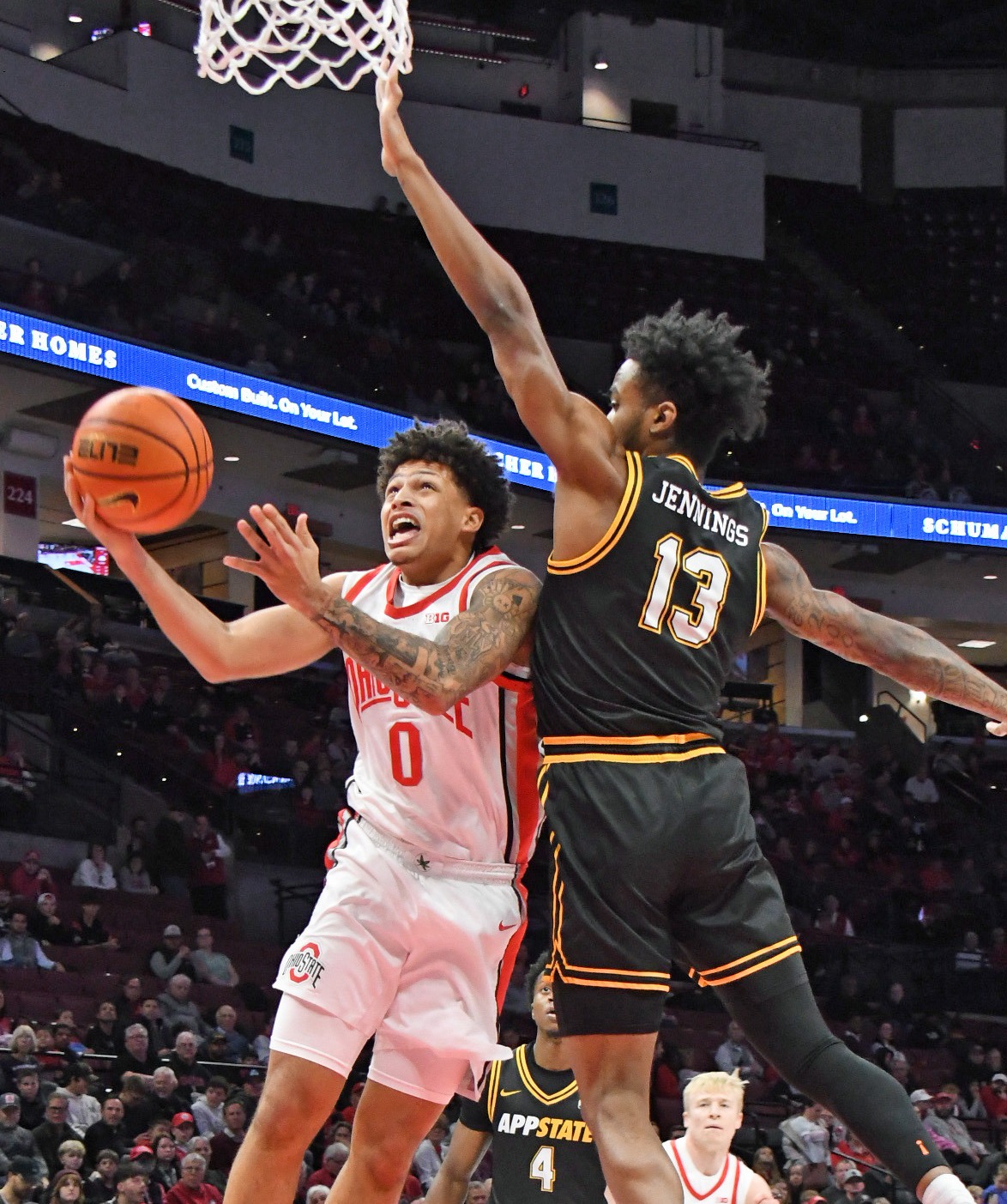 The Buckeyes were ice cold from the field to begin the game, scoring just two points in the first 6:30 of the game, missing each of its first eight three-point attempts during that span and making just 1 of 12 shots total. App State got out to a 10-2 lead with the help of five points from graduate guard Kasen Jennings.