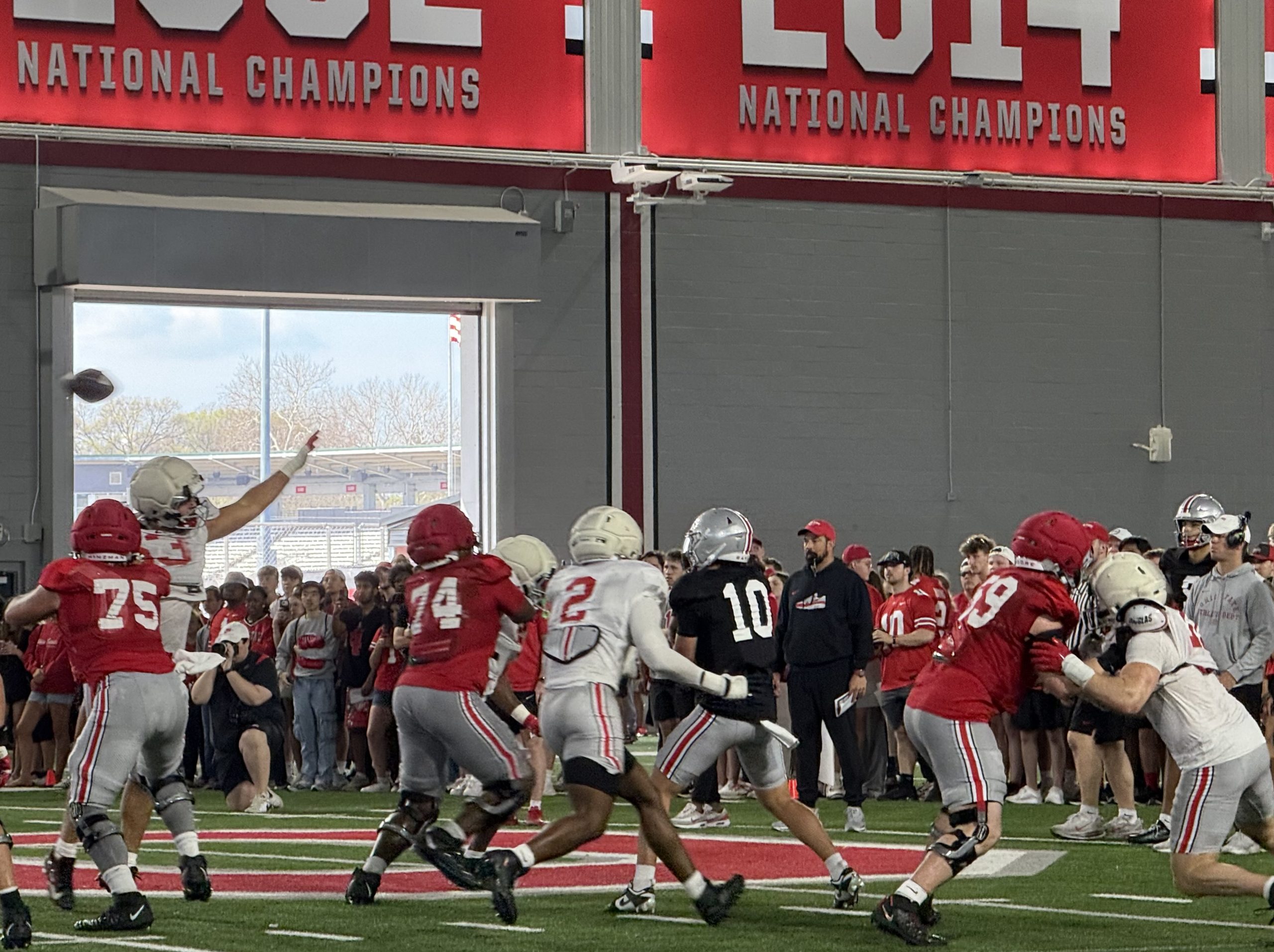 In their practice open to students, fans and media on student appreciation day on Saturday, Lowe and Moore had their share of struggles in pass protection, with Buckeye defensive lineman seemingly able to pressure rising sophomore starting quarterback Julian Sayin at will.