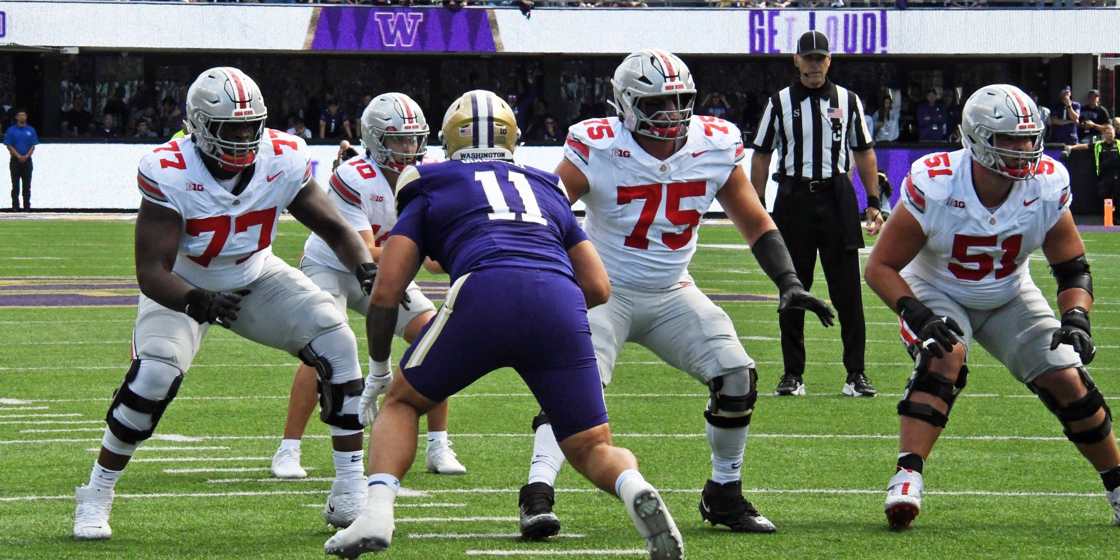 The Buckeyes’ front five was dealing with an injury to right guard Tegra Tshabola and was forced to play backups Gabe VanSickle and Josh Padilla, and an in-game injury to left tackle Austin Siereveld hindered the line further, forcing reserve tackle Ian Moore to see time. It was notably one of Ohio State’s worst offensive line performances of the season.