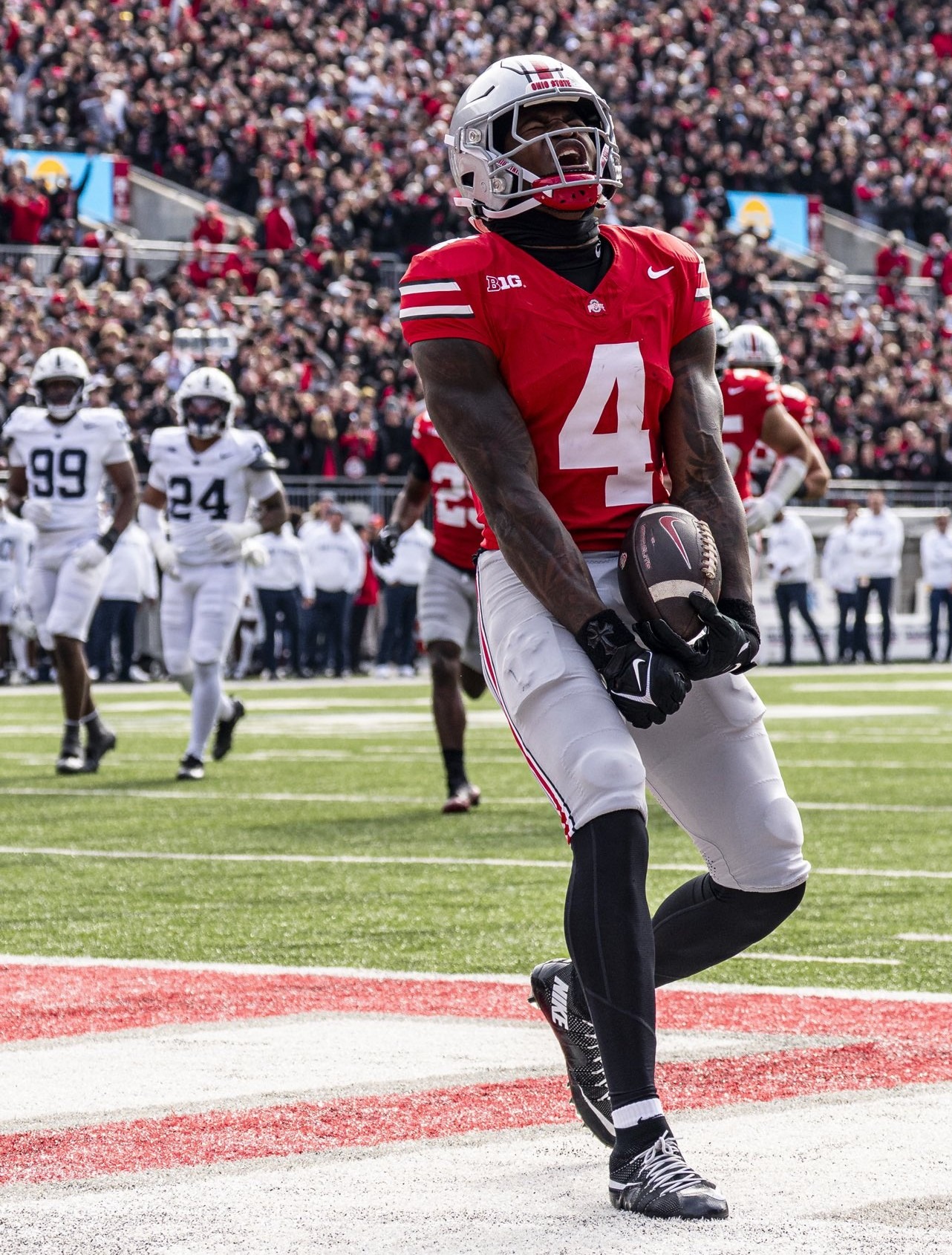 Julian Sayin threw for 316 yards with four touchdowns and receivers Jeremiah Smith and Carnell Tate each had more than 100 yards when top-ranked Ohio State survived a scare then scored 21 then pulled away for a 38-14 victory before 105,517 fans at Ohio Stadium on Saturday.