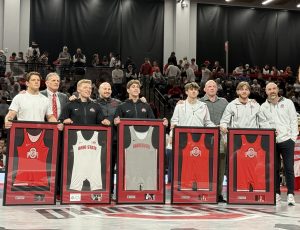 Before the dual began, Ohio State recognized five team managers along with senior and graduate wrestlers Peyton Fenton, Carter Chase, Paddy Gallagher, Carson Kharchla and Jesse Mendez, with the veteran Buckeyes receiving a standing ovation from the home crowd.